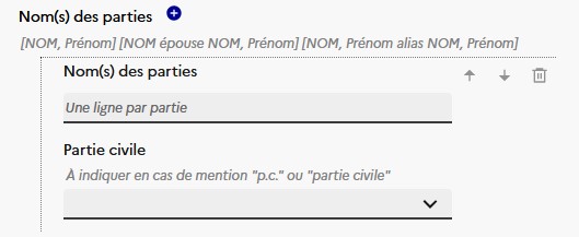 - Les noms de parties sont à enregistrer un par un, en générant pour chacun un nouveau sous-formulaire (bouton +). À cela s'ajoute la possibilité d'indiquer simplement si les parties citées sont parties civiles ;
