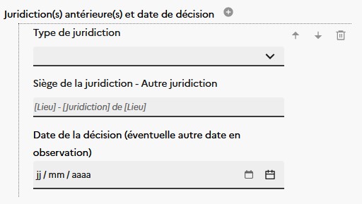 - Le champ "juridiction antérieure et date de décision" est entièrement repensé : une liste déroulante vous permet de sélectionner le type de juridiction (cour d'appel, cour d'assises, tribunal de simple police), puis vous n'avez ensuite qu'à préciser le siège de la juridiction dans le champ suivant. Cas particulier : si la juridiction n'apparait pas dans le menu déroulant, vous pouvez l'indiquer intégralement dans le champ suivant. La date de l'arrêt attaqué est à préciser dans un champ à part.