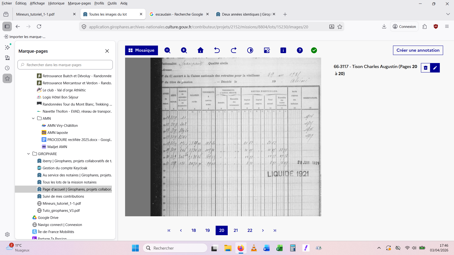 Néanmoins, dans les deux exemples que vous avez repérés, vous noterez qu'à gauche, dans la marge, on trouve "FS" pour chaque année en double. A priori, "FS" fait référence au fonds spécial de la Caisse qui était alimenté par des cotisations des employeurs et des travailleurs. Ce fonds était destiné, notamment, à majorer les pensions dans un certain nombre de cas : mineurs partant à la retraite sans avoir le nombre suffisant d'années de cotisations (parce qu'ayant commencé leur carrière avant la mise en place de la Caisse), mineurs dont la pension aurait été d'un montant supérieur s'ils étaient restés affiliés à leur caisse de retraite patronale d'avant 1914, pensions de réversion pour les veuves et orphelins de mineurs etc. J'essaierai d'expliquer tout ceci dans le document "Un peu d'histoire" qui sera accessible depuis la page du projet.