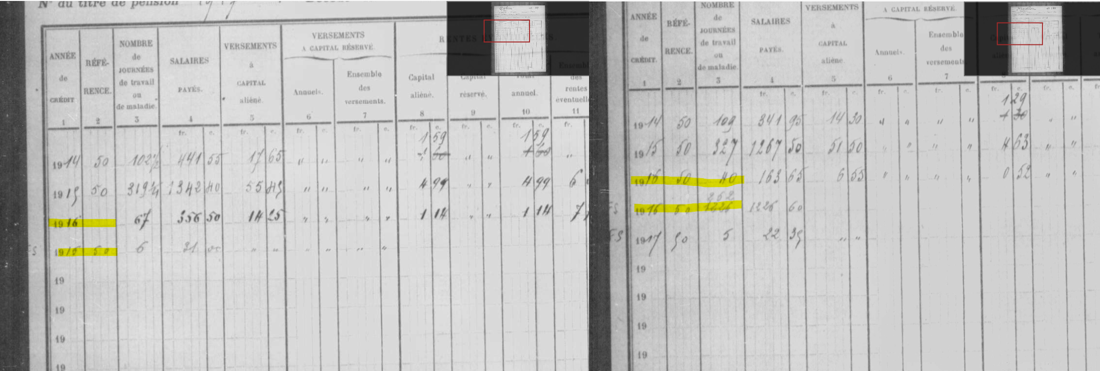 Néanmoins, dans les deux exemples que vous avez repérés, vous noterez qu'à gauche, dans la marge, on trouve "FS" pour chaque année en double. A priori, "FS" fait référence au fonds spécial de la Caisse qui était alimenté par des cotisations des employeurs et des travailleurs. Ce fonds était destiné, notamment, à majorer les pensions dans un certain nombre de cas : mineurs partant à la retraite sans avoir le nombre suffisant d'années de cotisations (parce qu'ayant commencé leur carrière avant la mise en place de la Caisse), mineurs dont la pension aurait été d'un montant supérieur s'ils étaient restés affiliés à leur caisse de retraite patronale d'avant 1914, pensions de réversion pour les veuves et orphelins de mineurs etc. J'essaierai d'expliquer tout ceci dans le document "Un peu d'histoire" qui sera accessible depuis la page du projet.