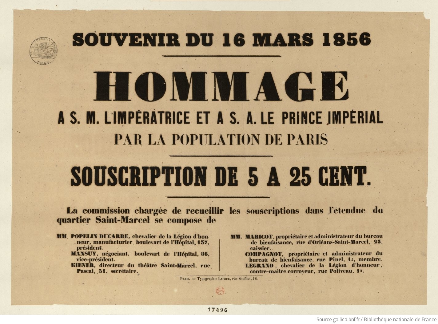 PartagerLe 16 mars 1856 naît à Paris le fils de Napoléon III et de l'impératrice Eugénie. À cette occasion, une grande souscription est lancée auprès des habitants du département de la Seine : chacun est appelé à contribuer à un cadeau destiné à l'impératrice, pour une somme comprise entre 5 et 25 centimes.
